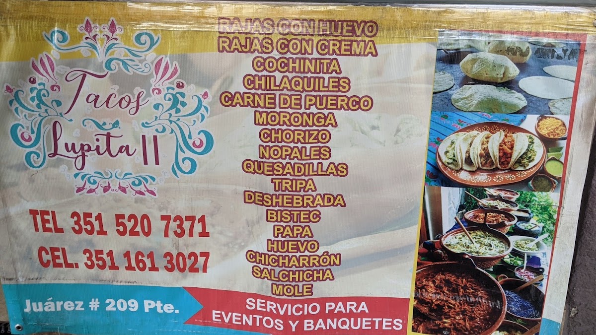 Tacos Lupita, tradicionales tacos en Zamora Michoacán, en una de las sucursales por avenida Juárez, bien atendida por su propietario Luis y familia. Gran variedad de guisados con tortillas calientes elaboradas en el momento, ricas aguas frescas y todo a buen precio y con atención en el lugar o llevado a tu casa o negocio.